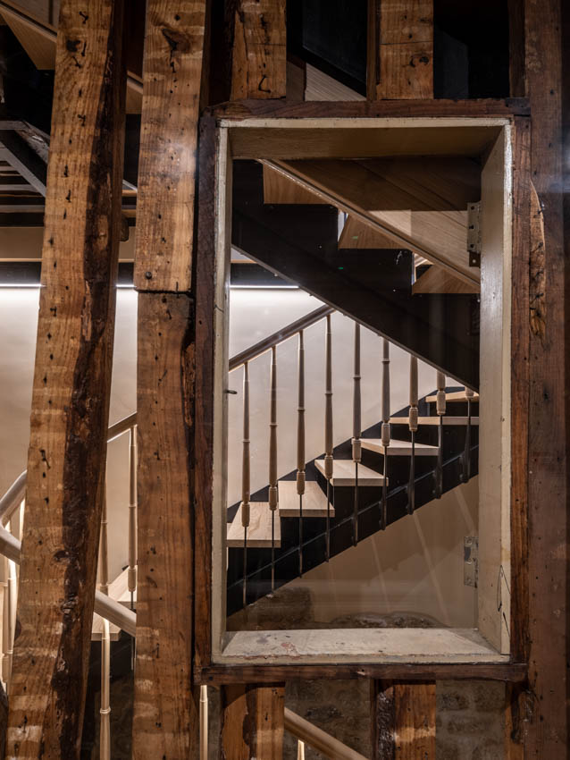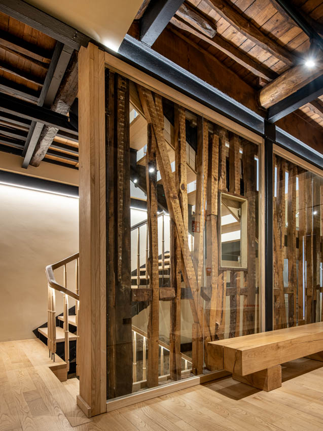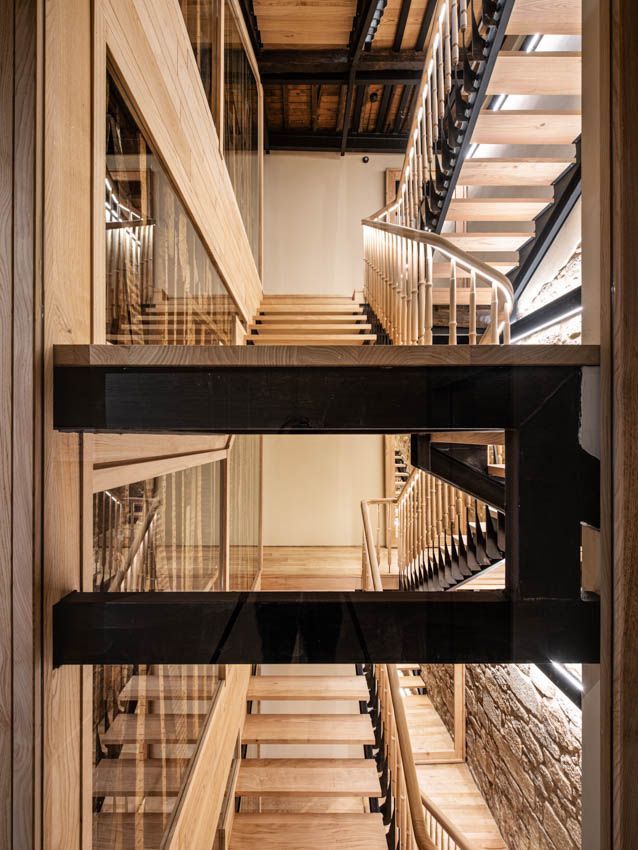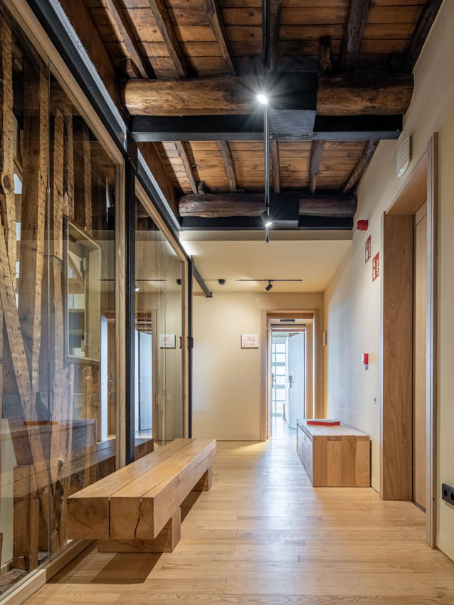 Lejos de proponer un edificio «nuevo», el proyecto parte del respeto por la arquitectura preexistente. El objetivo, como señalan sus autores, era “reparar, no solo construir”, tejiendo de nuevo una relación entre el inmueble, su historia y el entorno urbano. Así, se conservaron elementos como la estructura original de muros portantes y parte de la fachada, incorporando materiales naturales como la piedra, madera sin tratar, morteros de cal y tejidos orgánicos, lo que contribuye a la mejora de la calidad del aire interior y a la durabilidad del conjunto.