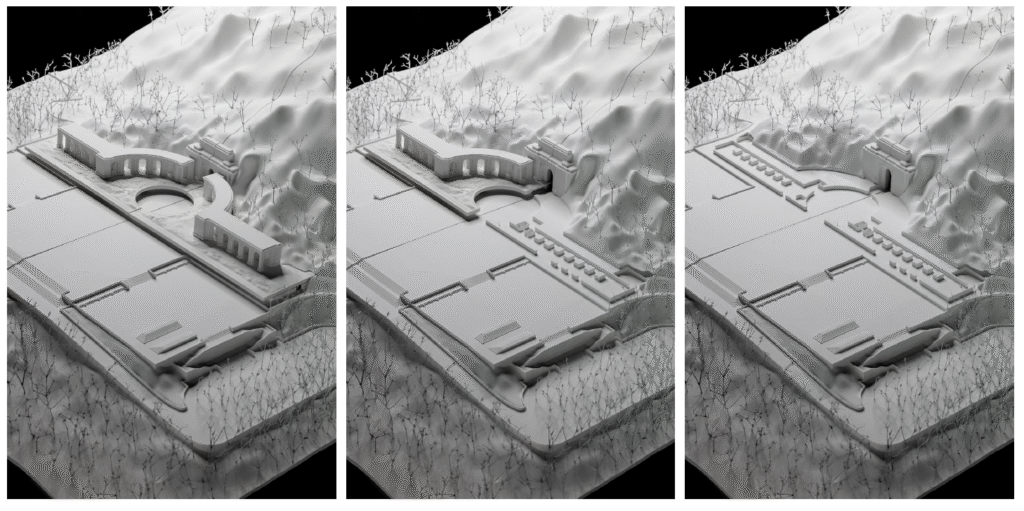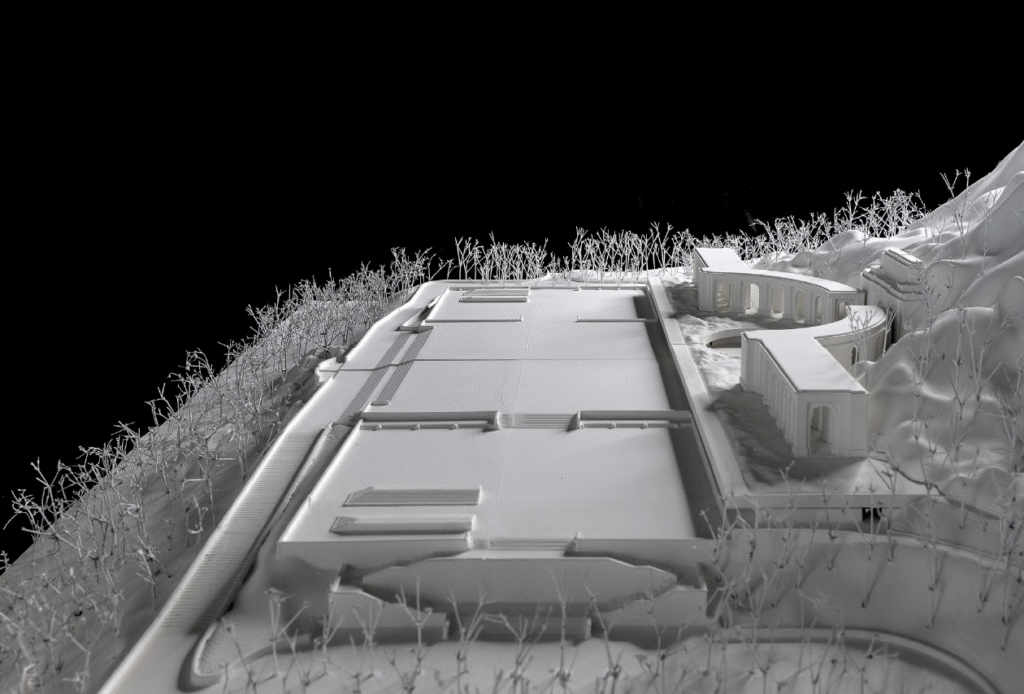 La propuesta ganadora plantea una nueva visión para el conjunto monumental desde una estrategia basada en la discreción y la transformación clara del entorno. Su planteamiento se organiza en torno a dos elementos principales: una nueva plataforma y un patio que la atraviesa. Estos dos ejes permiten reorganizar el espacio y resolver los condicionantes actuales con una intervención clara, sobria y rotunda.