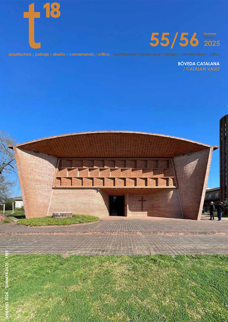 Este nuevo número doble de la t18 (nº 55/56) está dedicado a las bóvedas tabicadas, lo que aquí llamamos ‘voltes a la catalana’, que viven un curioso periplo entre ambas orillas del Atlántico en un viaje de ida y vuelta, del que regresan fortalecidas (como le pasó al idioma a finales del XIX). Por el número se pasean los nombres del valenciano Guastavino, del catalán Bonet Castellana, de Félix Candela, madrileño exiliado en México o del uruguayo Eladio Dieste… para acabar con sus hijos espirituales actuales: Alfonso Ramírez Ponce en México, Lucía Garzón en Colombia o el equipo de Bangoloo, dirigido por Oriol Rosselló en Catalunya. Solo para demostrar que las construcciones abovedadas están más vivas que nunca.