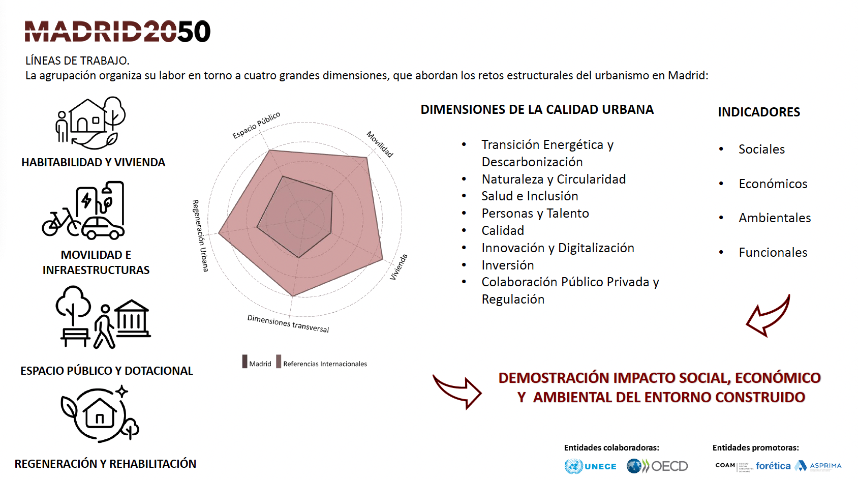 - Impulsado por la plataforma Madrid2050, de la que forman parte más de 75 entidades y empresas, este encuentro nace con vocación anual para reflexionar sobre cómo crecer, habitar y transformar las ciudades ante el reto demográfico, que en Madrid supondrá llegar a los 8 millones de habitantes en 2037