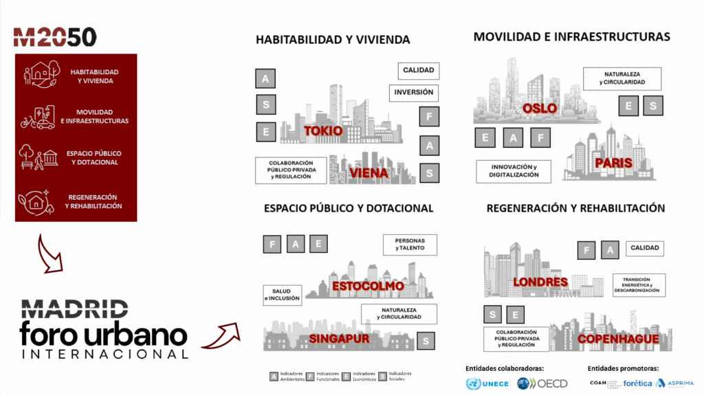 Para reflexionar sobre estos retos se ha creado Madrid Foro Urbano Internacional, que se celebrará los días 9, 10 y 11 de diciembre en la sede del Colegio Oficial de Arquitectos de Madrid (COAM). Enmarcado en la iniciativa Madrid2050 y liderado por el COAM, el foro convierte a Madrid en un laboratorio urbano internacional, donde responsables de estrategias urbanas, administraciones, arquitectos, académicos, promotores, y sociedad civil explorarán soluciones reales para afrontar los desafíos del siglo XXI, desde el acceso a la vivienda asequible hasta la promoción de una movilidad más sostenible, la regeneración urbana y la integración armónica de los nuevos desarrollos en el tejido urbano existente.