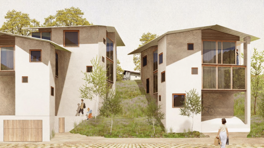 La propuesta se basa en la economía circular, fomentando el uso de recursos locales y técnicas constructivas de bajo impacto ambiental. Las viviendas integran materiales reciclados y soluciones de eficiencia energética adaptadas al clima de montaña. Además, el proyecto responde al desafío de la despoblación rural, ofreciendo viviendas asequibles que facilitan la permanencia de familias jóvenes en el entorno.