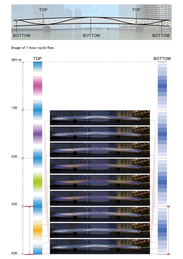 Situada en Chuo City, la estructura conecta la estación de Kachidoki con el barrio de Harumi 3-chome, atravesando el canal Asashio en dirección a la nueva Grand Marina Tokyo. Desde su apertura el 25 de marzo de 2024, la pasarela no solo ha facilitado la movilidad peatonal en la zona portuaria de la capital japonesa, sino que se ha convertido en un nuevo referente del paisaje urbano por su elegancia formal y su sensibilidad ambiental.