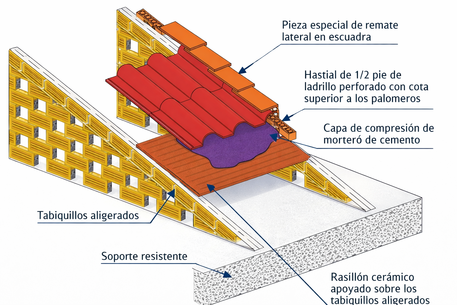 En primer lugar, se aborda la formación de la pendiente que permite configurar la inclinación de la cubierta y generar una cámara de aire interior; esto se consigue con la realización de fábricas de cubierta que pueden ser de tres tipos: Tabiquillos aligerados, hastiales y petriles. Sobre estas fábricas se dispone el tablero cerámico que sirve de base para las capas superiores.