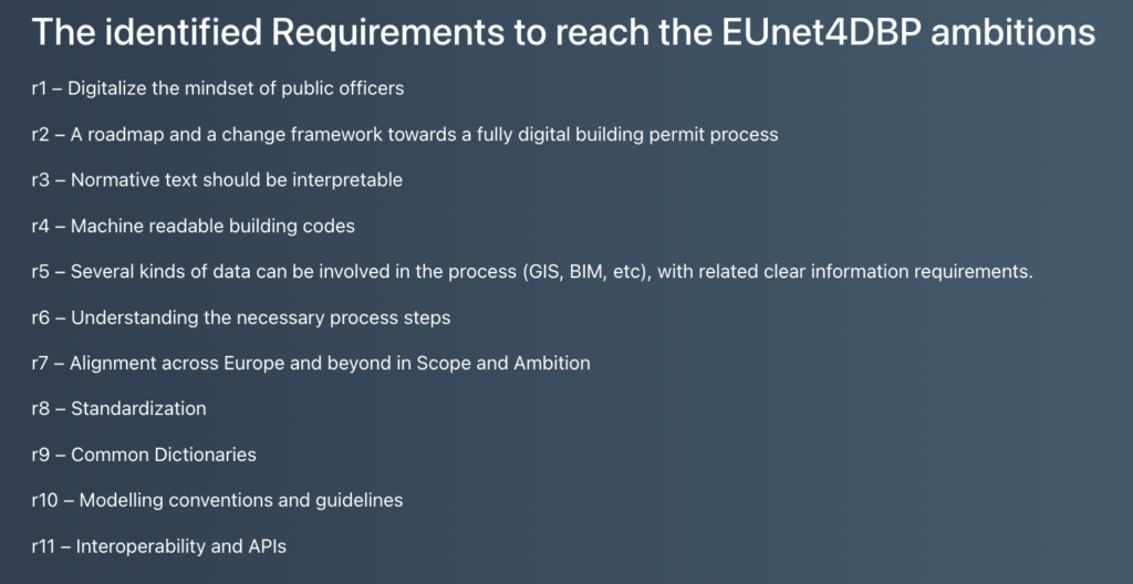Desde el mundo del BIM se está trabajando muy duro en este sentido y existe un grupo europeo, llamado EUnet4DBP o sea European Union network for Digital Building Permits que está realizando grandes esfuerzos para identificar los “pains” e impulsar la digitalización de los procesos para hacer “machine-readable” los documentos de un proyecto y así lanzar un informe automático con todo lo que cumple y no cumple su ejecución.