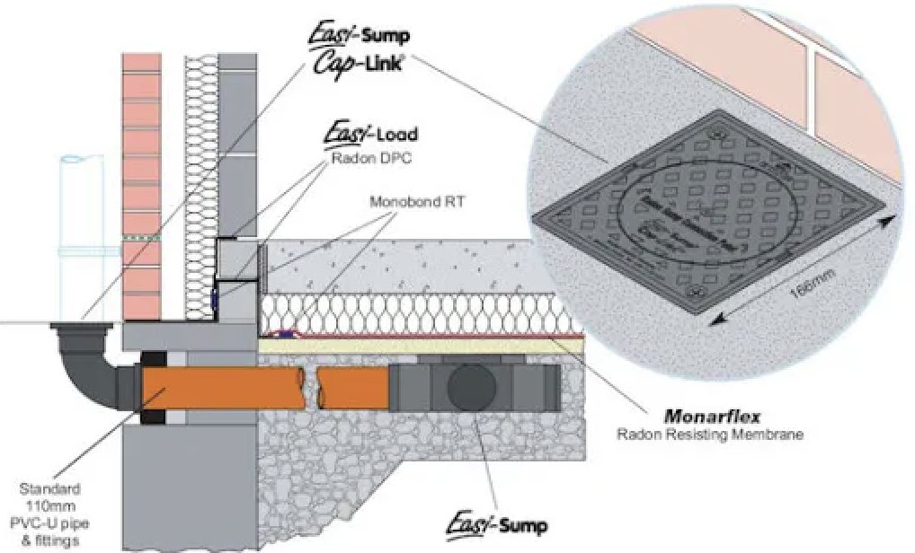 - Aplicación: Sistema de evacuación de radón desde el terreno mediante ventilador, especialmente en rehabilitación o zonas de riesgo.