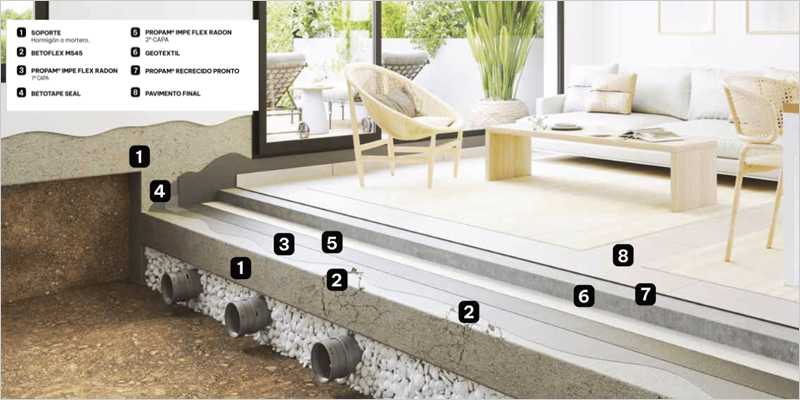 - Certificar que los materiales utilizados (láminas, membranas) tienen ensayo de difusión al radón o están diseñados para ello.