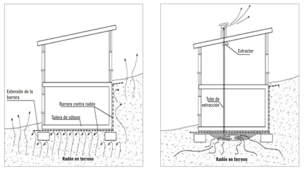 - Barreras constructivas para evitar la entrada del radón desde el terreno. La publicación Consejo de Seguridad Nuclear (CSN) “Protección frente a la inmisión de gas radón en edificios” ofrece una guía técnica de ejecución.