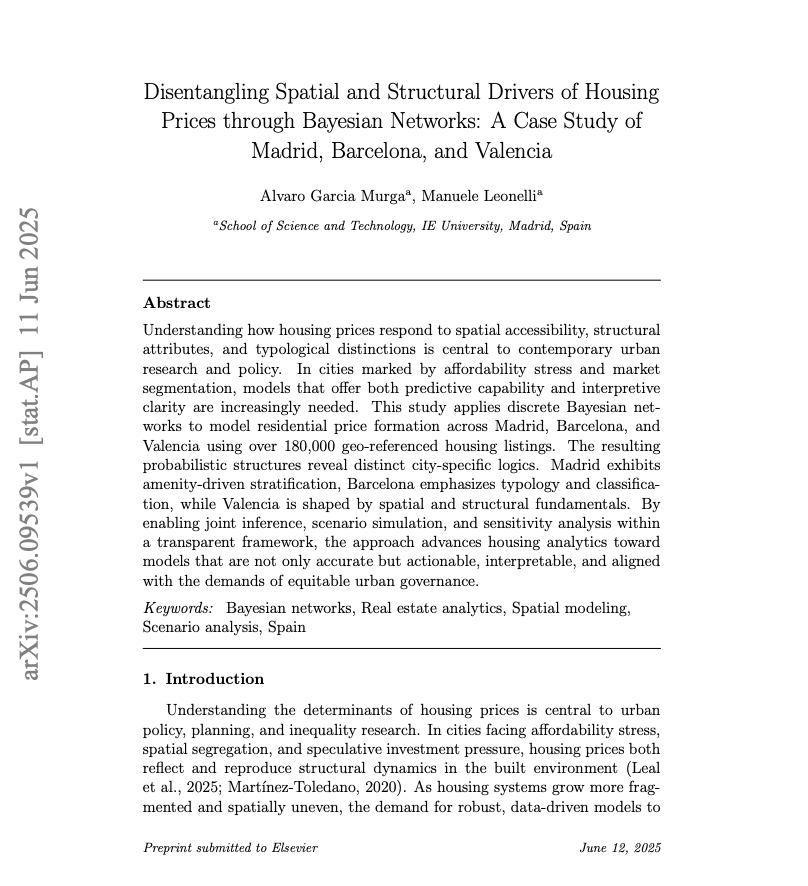 - “Disentangling Spatial and Structural Drivers of Housing Prices through Bayesian Networks: A Case Study of Madrid, Barcelona, and Valencia” Álvaro García Murga, Manuele Leonelli. Más de 180.000 viviendas analizadas en Madrid, Barcelona y Valencia para entender qué determina sus precios.