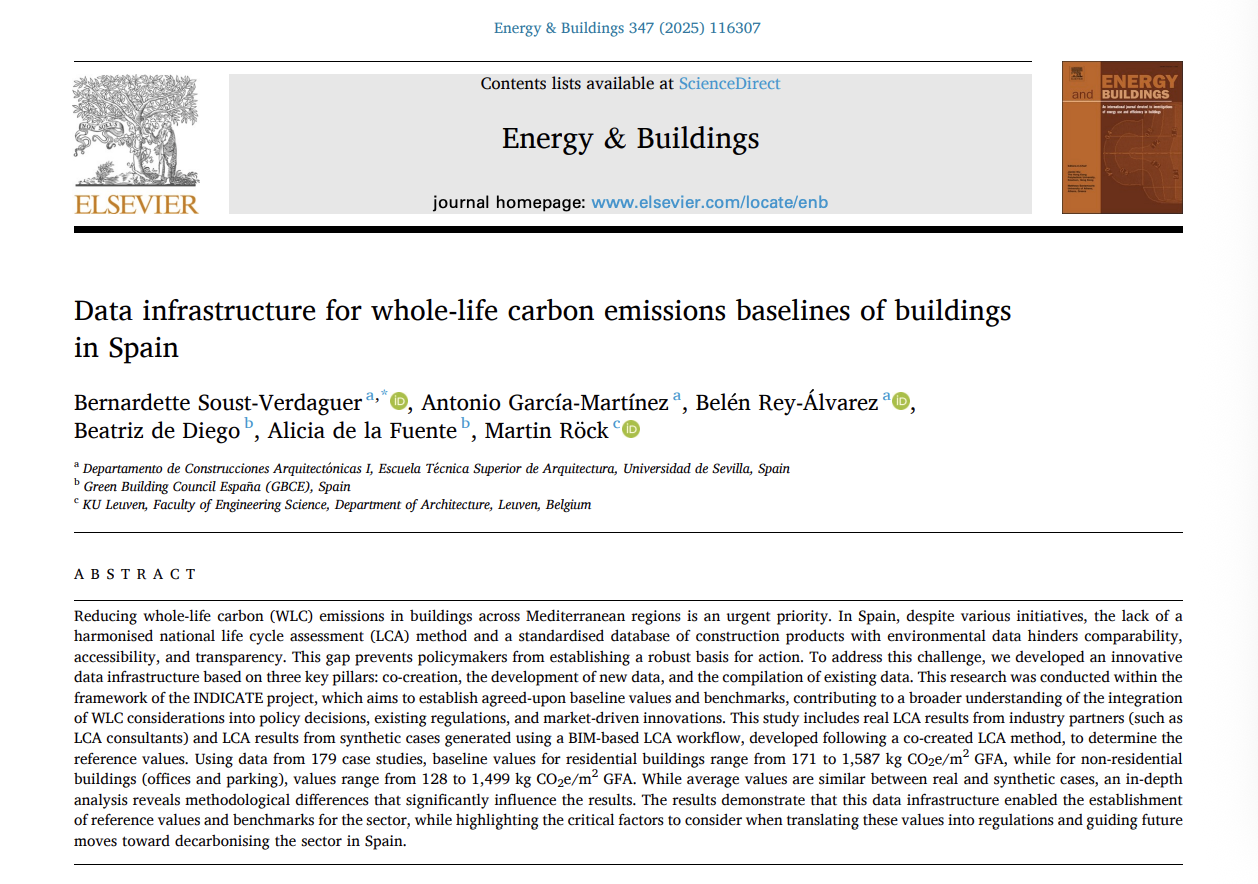 - “Data infrastructure for whole-life carbon emissions baselines of buildings in Spain” Antonio García-Martínez, Belén Rey-Álvarez, Bernardette Soust-Verdaguer. Ofrece una infraestructura de datos para cuantificar el carbono embebido y operacional en edificios españoles.