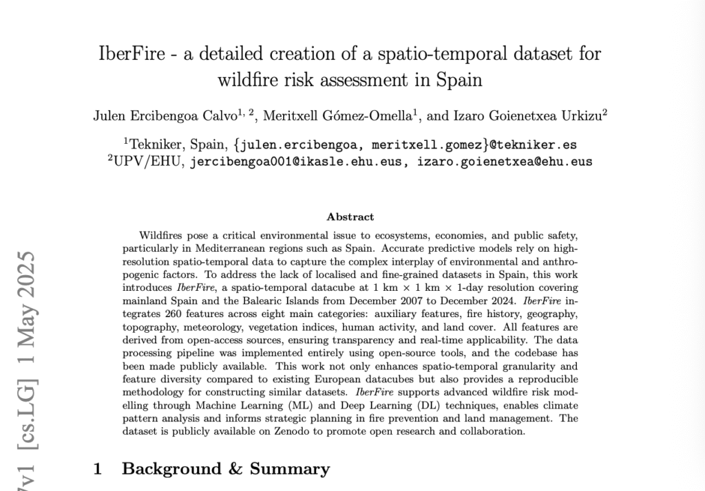 - “IberFire — a detailed creation of a spatio-temporal dataset for wildfire risk assessment in Spain” Julen Ercibengoa, Meritxell Gómez-Omella, Izaro Goienetxea. Dataset con 260 variables para modelar el riesgo de incendio en todo el país. Clave para urbanismo y construcción en interfaz forestal.