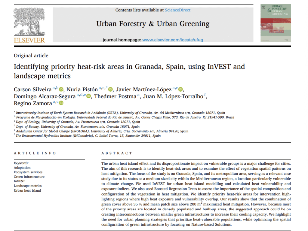 - “Identifying priority heat-risk areas in Granada, Spain, using InVEST and landscape metrics” Alcaraz Segura, Domingo; López-Torralbo, Juan M.; Martínez-López, Javier; Pistón, Nuria; Postma, Thedmer; Silveira, Carson; Zamora Rodríguez, Regino Jesús. Mapa térmico y propuestas de mitigación con vegetación en Granada — extrapolable a ciudades mediterráneas.