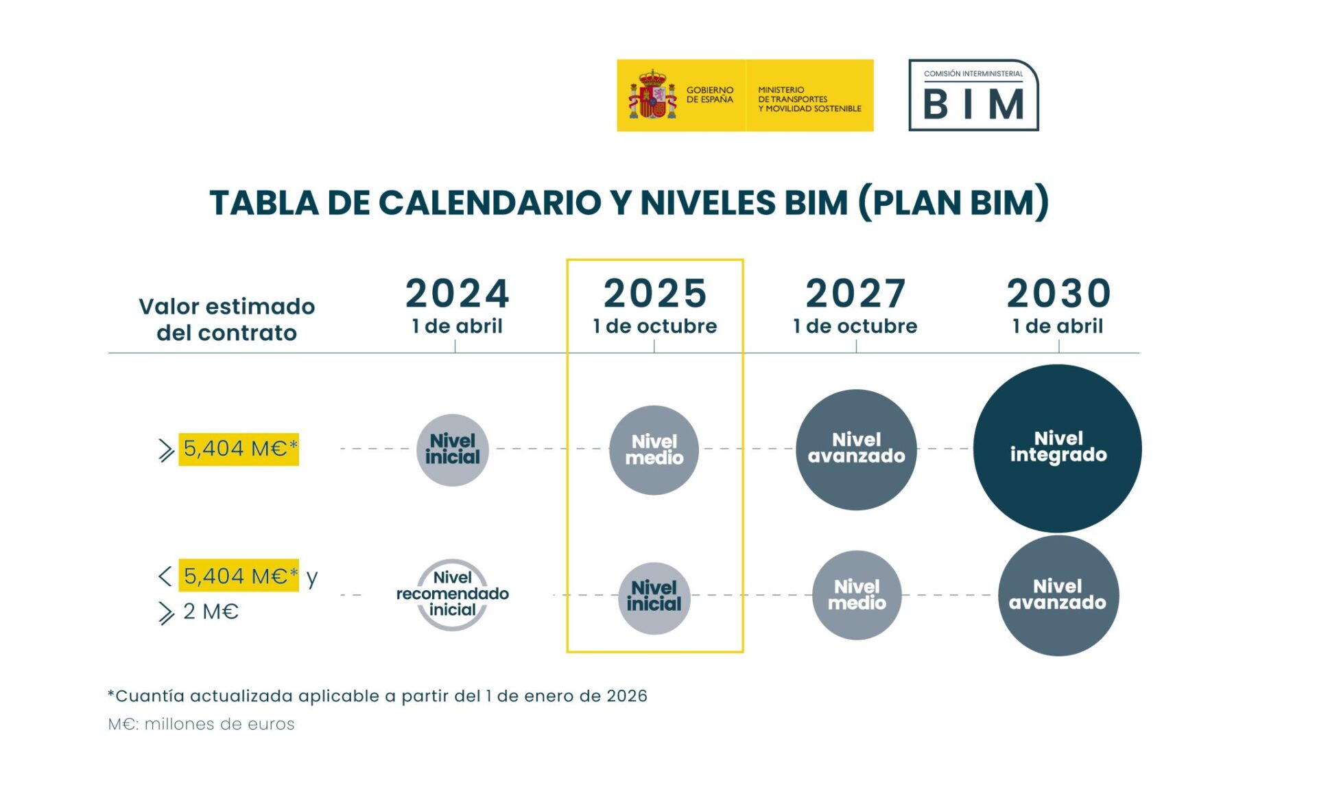 - Los contratos de obras con un importe igual o superior a 5.404.000 euros deberán incluir requisitos de información BIM correspondientes a un Nivel BIM Medio.