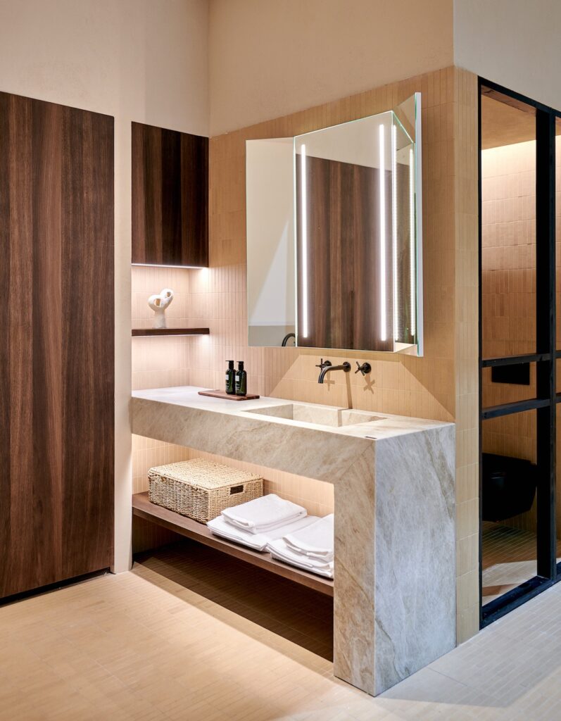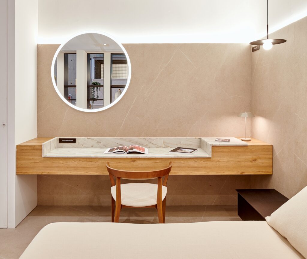 El espacio recrea una secuencia de ambientes —recepción, habitación y baño de hotel— que ilustran cómo los materiales pueden conjugar belleza, sostenibilidad y rendimiento técnico en proyectos hoteleros y contract.
