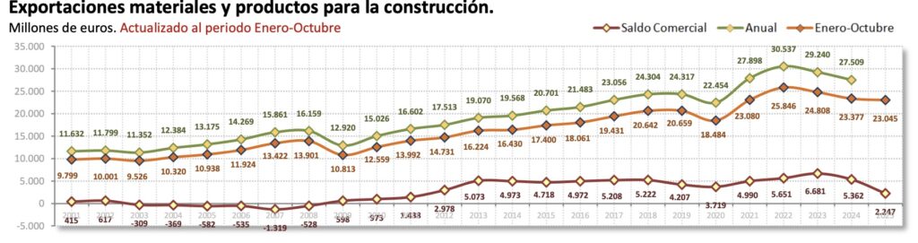 Las exportaciones de materiales de construcción mantienen una evolución negativa en el acumulado enero-octubre, con una caída del -1,4%. No obstante, el informe destaca una clara desaceleración del descenso, lo que apunta a una cierta estabilización de la demanda exterior tras más de dos años de retrocesos continuados. De hecho, el sector encadena ya treinta meses consecutivos de variaciones negativas en términos anuales, un dato que evidencia la persistencia de las dificultades estructurales en los mercados internacionales.