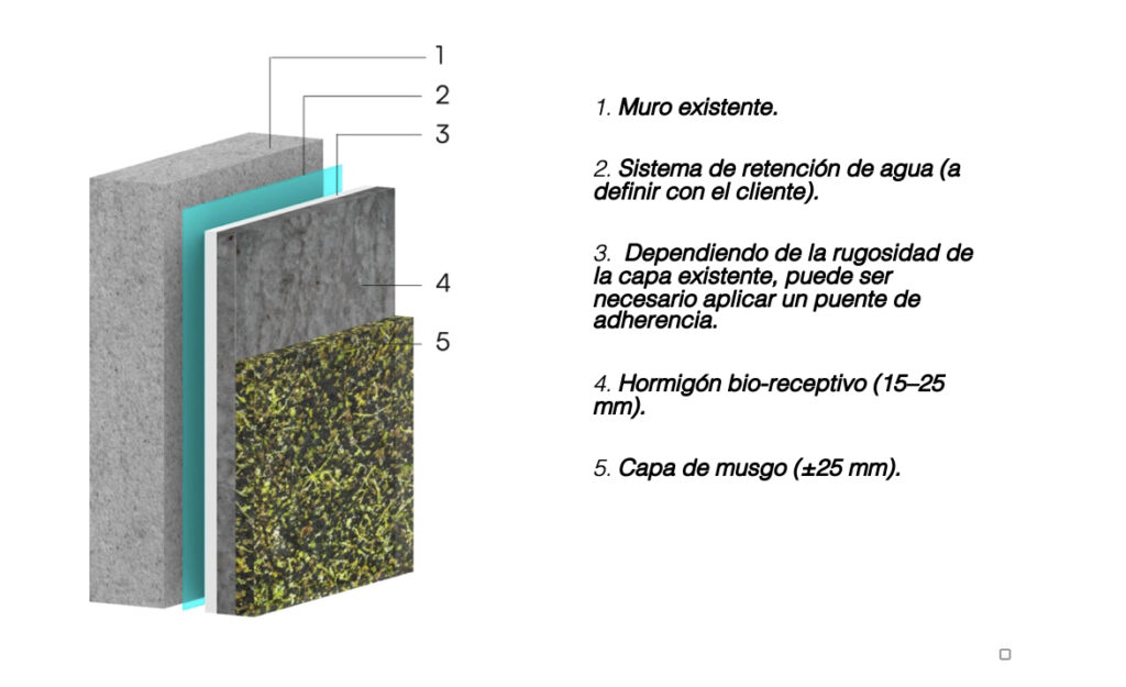 Además de esta optimización hídrica, la superficie del hormigón se modifica para crear una microtopografía que facilite la implantación de las esporas. A esto se suma la selección de especies de musgo adaptadas a las condiciones climáticas del entorno urbano.