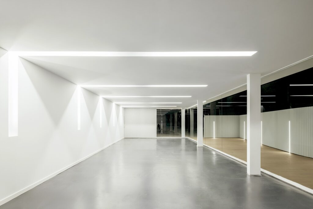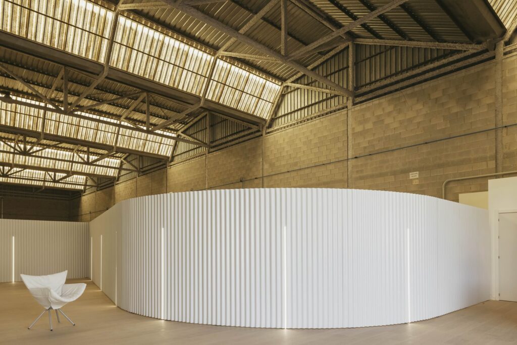La manipulación de la envolvente arquitectónica —mediante pliegues, curvaturas y desplazamientos— genera una experiencia háptica singular, amplificando la relación entre cuerpo y espacio. El contraste deliberado entre la frialdad industrial preexistente y la pureza del nuevo interior, dominado por superficies blancas y paneles móviles, potencia los valores de claridad, luz y percepción sensorial.
