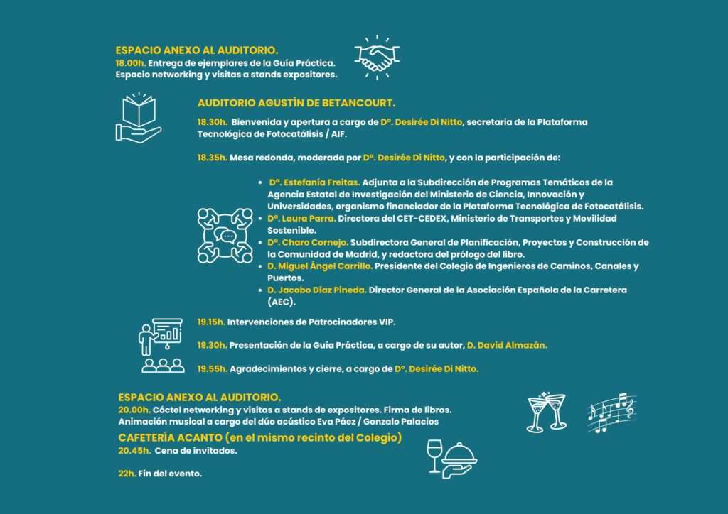 El acto de presentación contará con un coloquio preliminar en el que participarán, junto al autor de la Guía Práctica, Dª Estefanía Freitas adjunta a la Subdirección de Programas Temáticos de la Agencia Estatal de Investigación, Dª Laura Parra directora del CET CEDEX Ministerio de Transportes y Movilidad Sostenible, Dª Charo Cornejo subdirectora general de Planificación Proyectos y Construcción de la Comunidad de Madrid autora del prólogo de la Guía Práctica, D Miguel Ángel Carrillo presidente del Colegio de Ingenieros de Caminos, Canales y Puertos, D Jacobo Díaz Pineda director general de la Asociación Española de la Carretera. Posteriormente será presentada la obra por su autor, para posteriormente concluir con un coctel de despedida y la firma de libros por parte del autor.