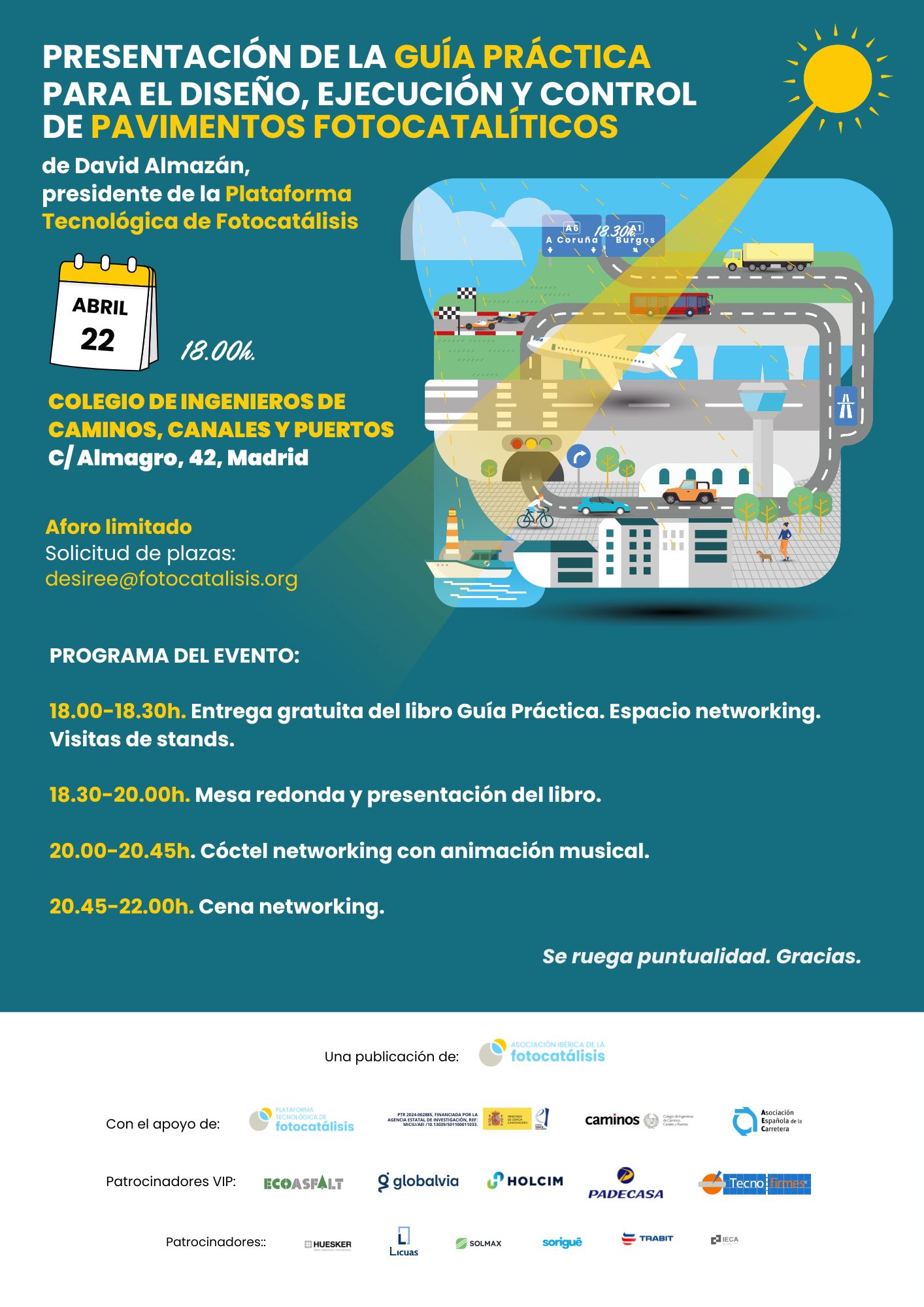Todos estos resultados se recogen en la Guía Práctica para el diseño, ejecución y control de pavimentos fotocatalíticos, que se presentará el próximo 22 de abril a las 18:30 en el Auditorio Agustín de Betancour, en la sede del Colegio de Ingenieros de Caminos, Canales y Puertos calle Almagro 42 Madrid. El acto reunirá a destacadas figuras del ámbito de las infraestructuras, la ingeniería y la innovación tecnológica.