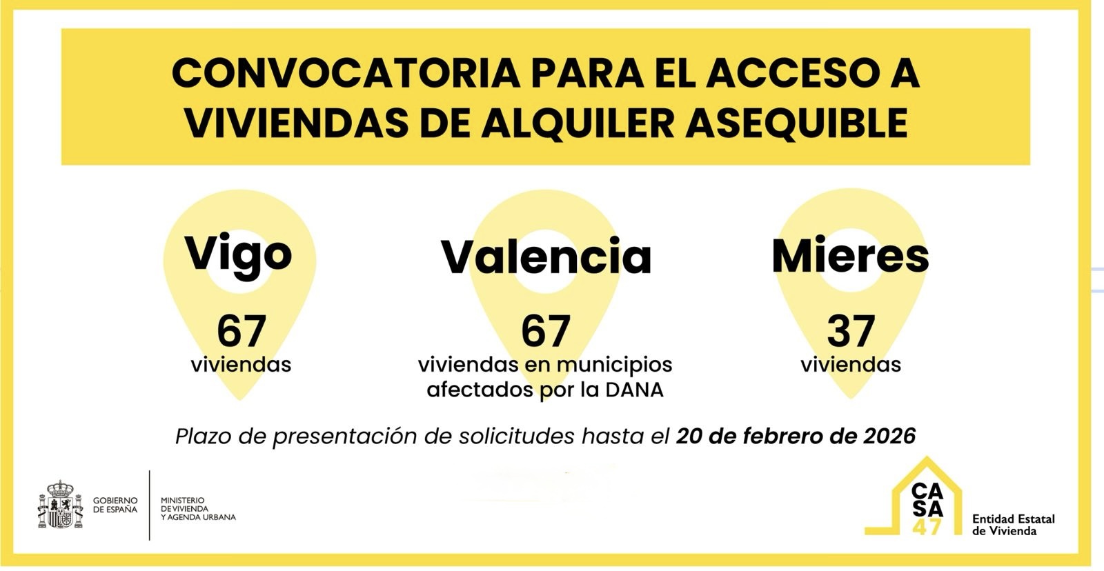 Las viviendas proceden en su mayoría del parque de la Sareb y se distribuyen en tres territorios: 67 viviendas en Vigo (Pontevedra), 67 en distintos municipios de la provincia de Valencia y 37 en Mieres (Asturias). El plazo de inscripción permanecerá abierto hasta el 20 de febrero de 2026 y el proceso de adjudicación se realizará mediante sorteo ante notario, garantizando criterios de transparencia y concurrencia pública.