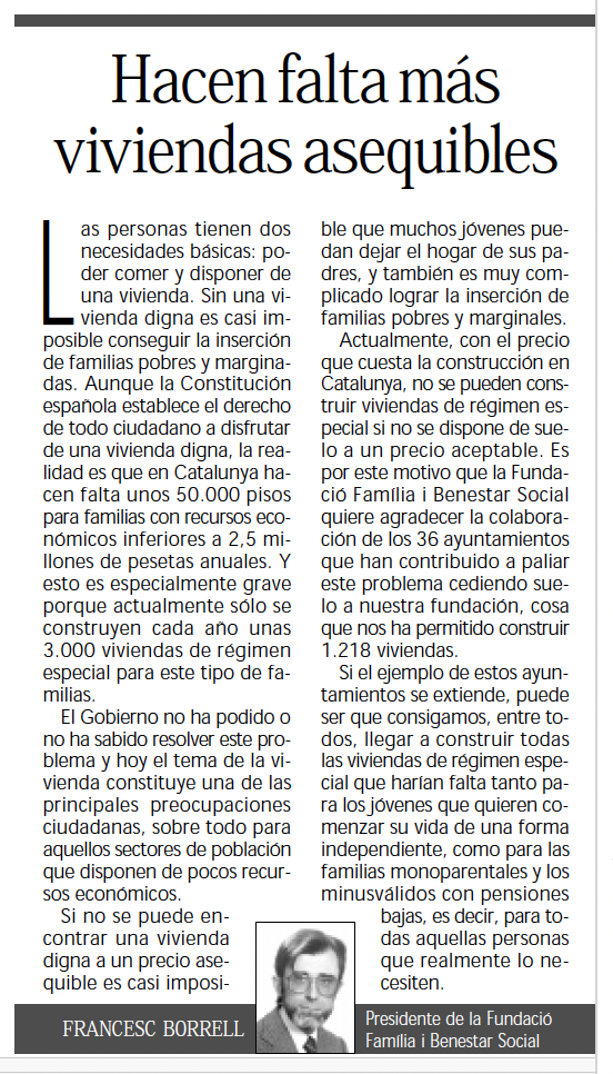 Aunque la Constitución española establece el derecho de todo ciudadano a disfrutar de una vivienda digna, la realidad es que en Catalunya hacen falta unos 50.000 pisos para familias con recursos económicos inferiores a 2,5 millones de pesetas anuales. Y esto es especialmente grave porque actualmente solo se construyen cada año unas 3.000 viviendas de régimen especial para este tipo de familias.