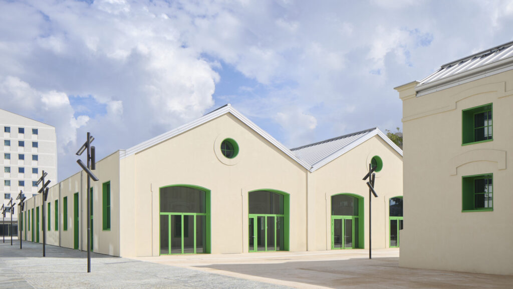 Se restauran envolventes y cubiertas, se conservan estructuras de hierro y mampostería visibles y se introducen nuevas cubiertas de madera e instalaciones contemporáneas.